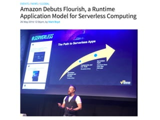 The document discusses best practices and insights for deploying AWS Lambda in production, emphasizing the importance of testing, monitoring, and configuration management. It highlights strategies for cost efficiency, error handling, and serverless architecture design, while also stressing the need for centralizing logs and managing serverless functions effectively. Key aspects include leveraging end-to-end testing, maintaining clear documentation, and understanding the limits and capabilities of AWS Lambda services.