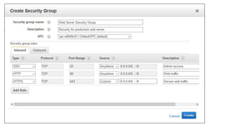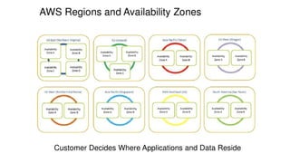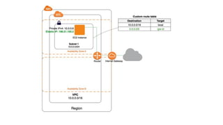 This document provides an overview of key networking components in Amazon Web Services (AWS) including: