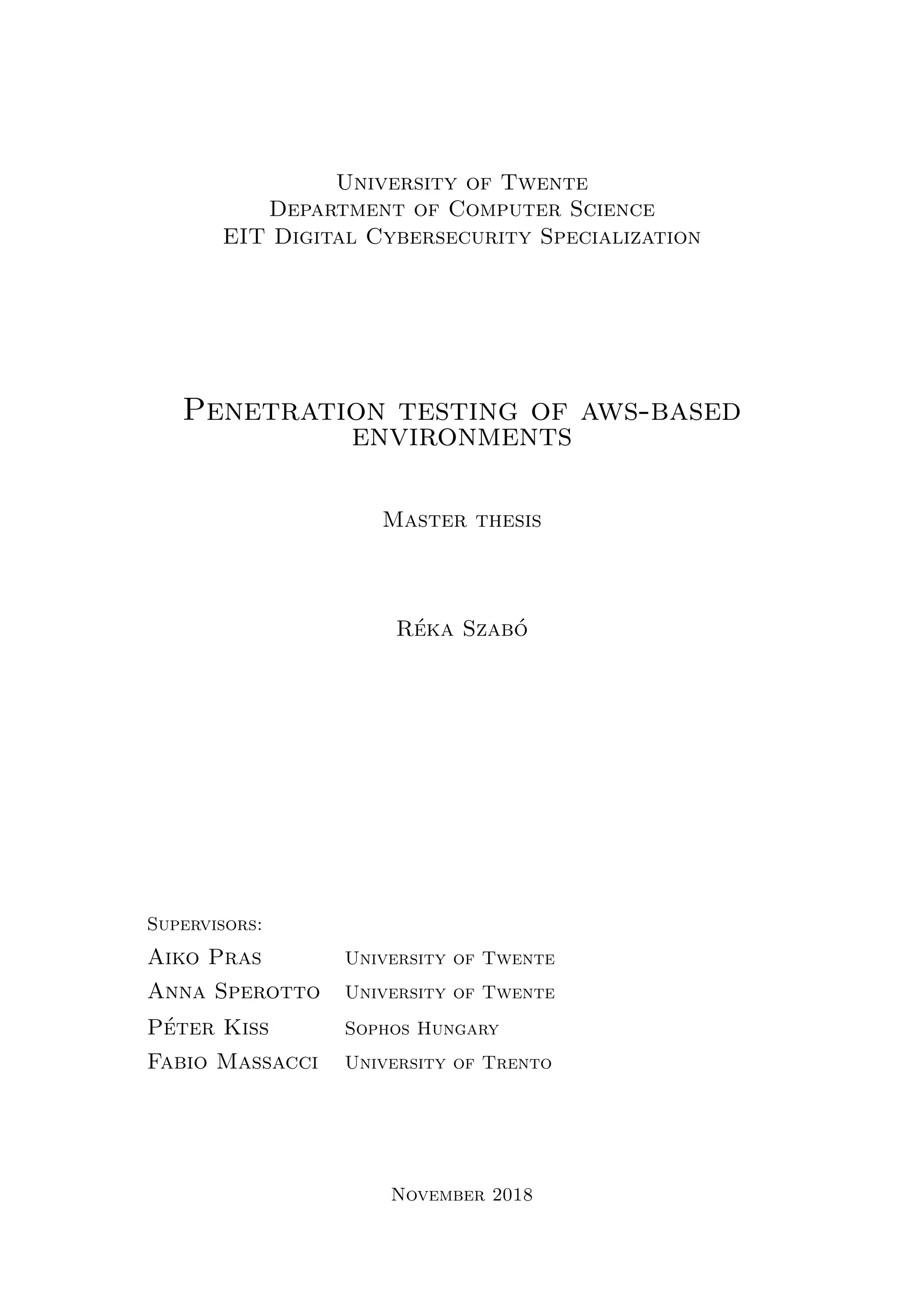 This document is the master's thesis of Réka Szabó titled "Penetration testing of aws-based environments". The thesis investigates how penetration testing techniques can be applied specifically to AWS environments. It outlines a general penetration testing methodology for AWS, integrating existing tools into the process. A major focus is on authenticated penetration tests, where credentials are provided to allow testing for internal misconfigurations. The thesis contains chapters on AWS services, common AWS security issues, penetration testing methodology, and describes conducting both non-authenticated and authenticated penetration tests of AWS environments.