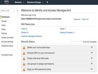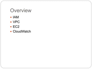 IAM controls access to AWS services and resources by managing users, groups, roles, and policies. VPC allows users to define their virtual networking environment, including subnets and security controls. EC2 provides on-demand scalable compute capacity in the cloud. CloudWatch monitors AWS and application resources, sets alarms, and reacts to changes in metrics and log data.