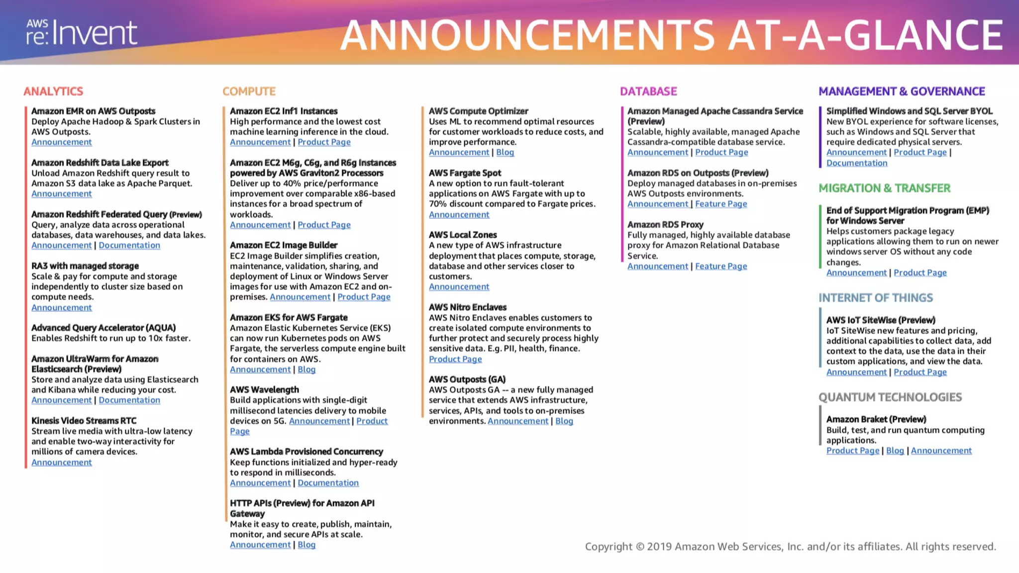 The document provides an overview of announcements from Amazon Web Services' annual re:Invent conference in December 2019. Key details include: