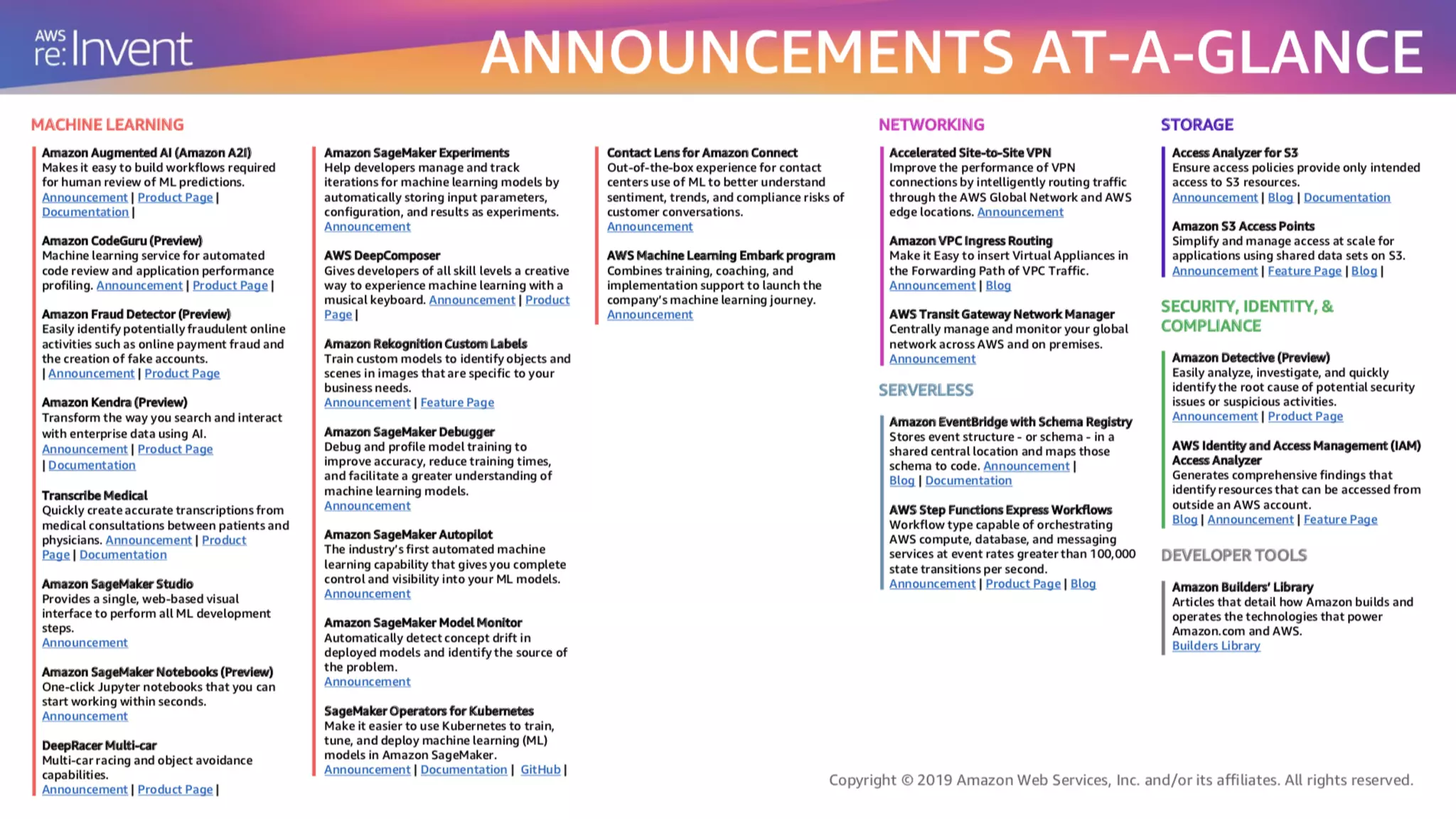 - New services and features were announced for Lambda, API Gateway, Step Functions, EventBridge, Amplify, SageMaker, EC2, EKS, EBS, S3, Rekognition, Lex, Translate, Transcribe, Comprehend, Personalize, Forecast, Fraud Detector, and more.