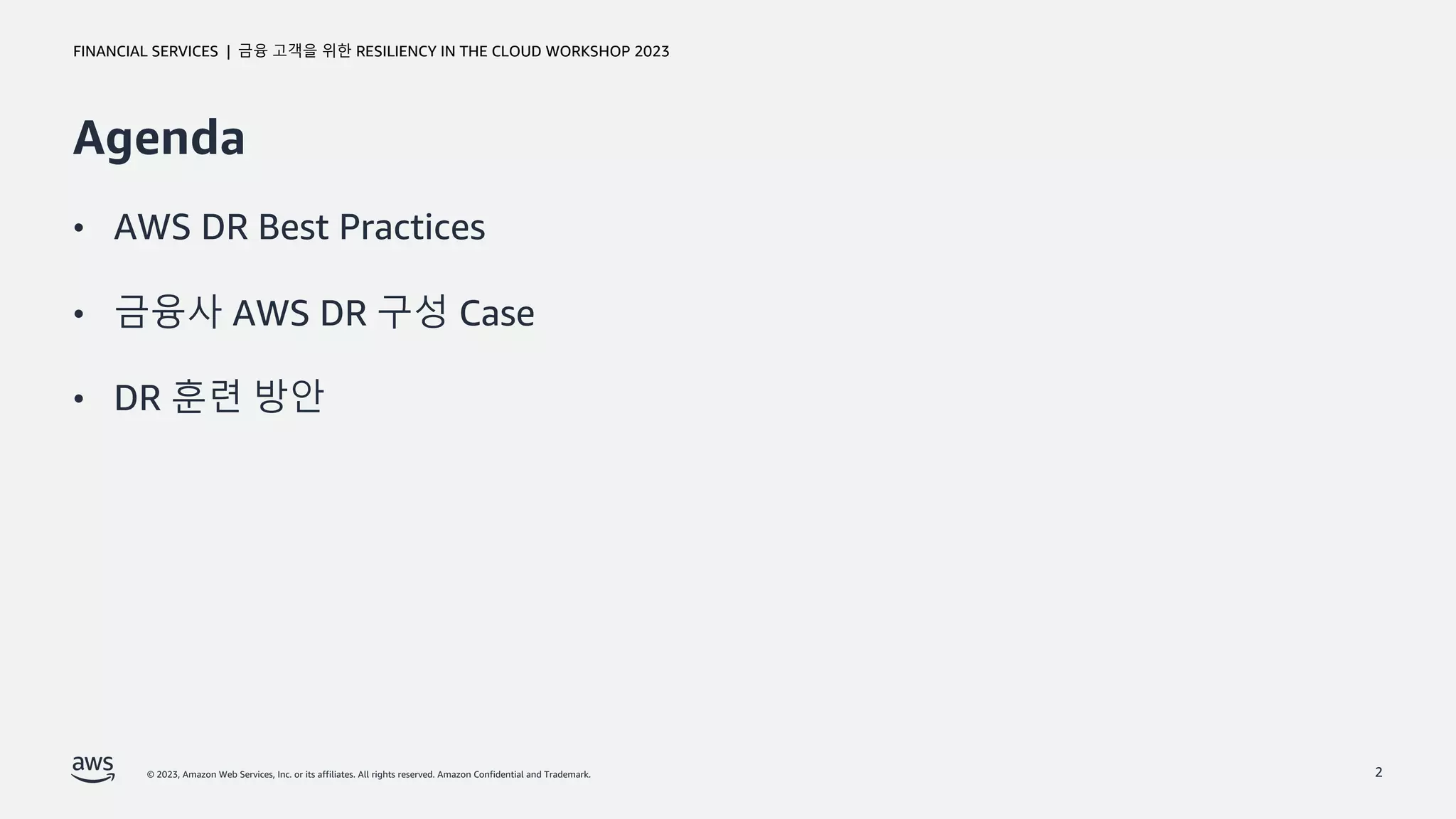 이 세션에서는 AWS를 사용할 때 구성할 수 있는 다양한 재해복구를 대비한 Resiliency 구성에 대한 베스트프랙티스를 우선 살펴보고자 합니다. 그리고 실제 다른 금융사들에서는 AWS를 활용해서 어떻게 재해복구에 대한 Resilientcy를 구성해서 활용하고자 하는지에 대해서도 알려드리고자 합니다. 또한 AWS클라우드를 사용할 때, 금융사들이 준수해야 하는 DR훈련들은 어떤 식으로 방법으로 가능한지에 대해서도 아이디어를 제공해 드리고자 합니다.