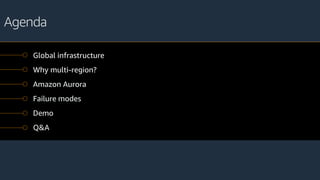 The document presents a session led by Cobus Bernard, a Senior Developer Advocate at Amazon Web Services, focusing on understanding multi-region architecture and the benefits of using AWS's global infrastructure. It highlights AWS's extensive network, including 24 regions, 76 availability zones, and various services like Amazon Aurora and CloudFront, emphasizing the significance of data redundancy and low latency for end-users. Additionally, it covers the architectural considerations for databases across multiple availability zones and regions, addressing potential failure modes and best practices.