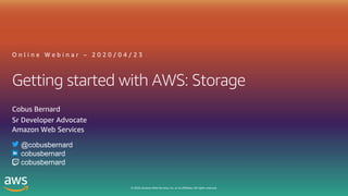 The document summarizes an AWS webinar on storage options. The webinar agenda includes overviews of AWS RDS, S3, EBS, and EFS storage services. It then discusses Amazon Aurora in more detail, describing it as a relational database built for the cloud that offers the performance and availability of commercial databases at 1/10 the cost, with features including scalability, availability, security, and full management.