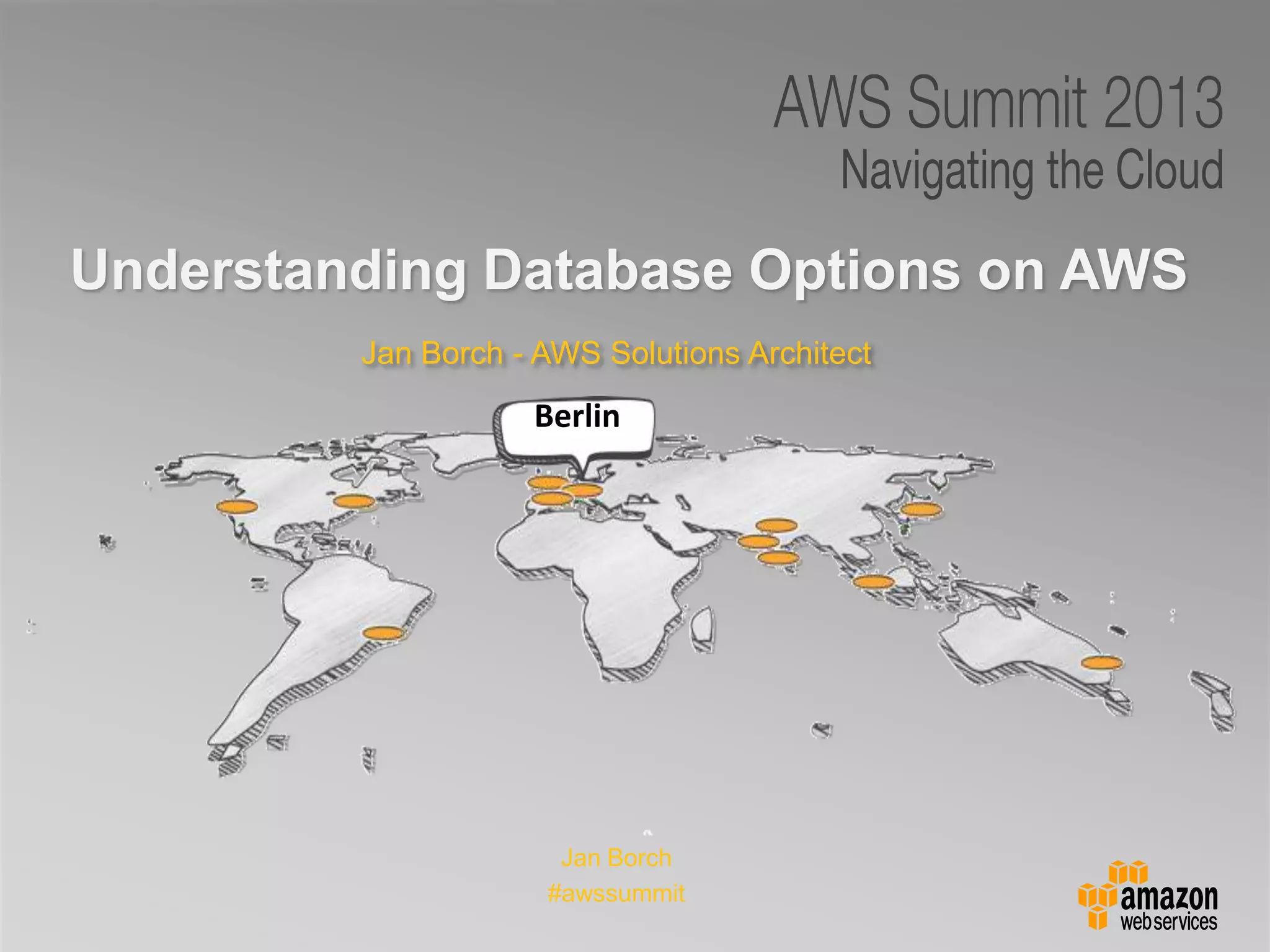 This document provides an overview of database options on AWS, highlighting the ease of starting applications with various services. It discusses the differences between SQL and NoSQL databases, the benefits of managed services like Amazon RDS and DynamoDB, and the considerations for choosing the right database solution based on application needs. Additionally, it covers features of Amazon Redshift as a managed data warehouse for analytical processing.