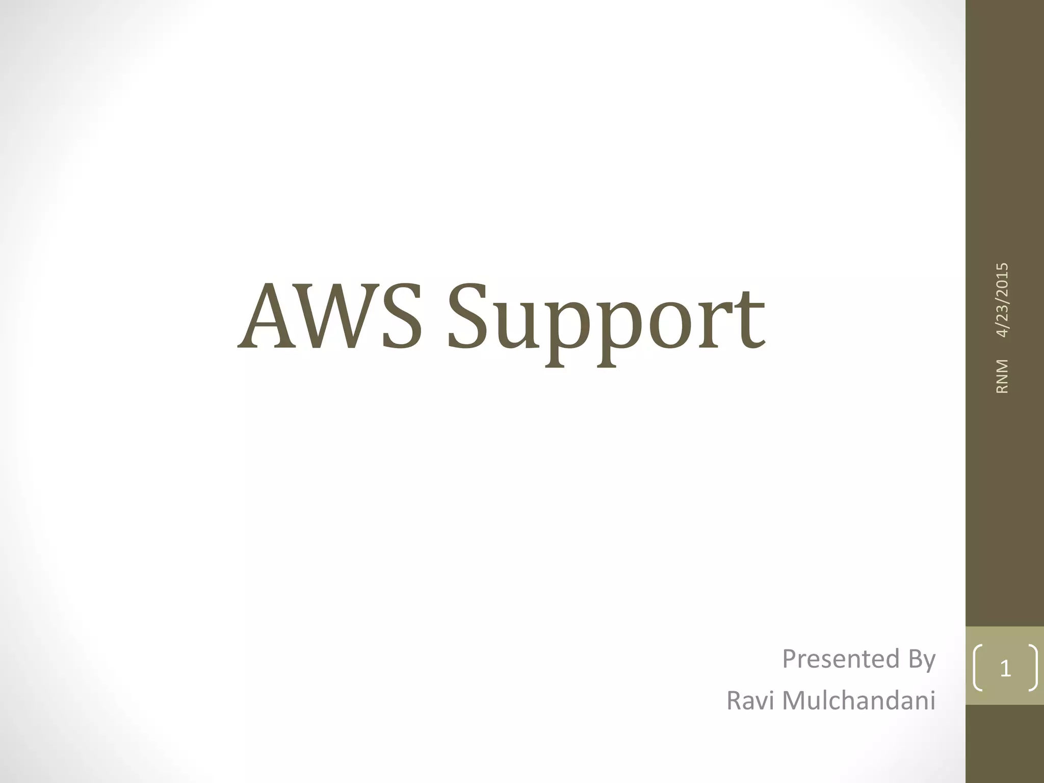 This document provides an overview of AWS Support, including its features and pricing models. It describes the four support tiers - Basic, Developer, Business, and Enterprise - and explains their differing levels of technical support and features. Key features covered include AWS Trusted Advisor, the Support Center, health checks, best practice guidance, and management tools for Enterprise customers. Pricing is outlined for each support tier, and examples of customers using AWS Support are listed.