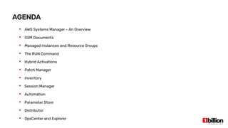 This document provides an overview and agenda for an AWS Systems Manager November 2020 meetup. It discusses the key capabilities of AWS Systems Manager including SSM documents, managed instances, resource groups, RUN commands, hybrid activations, patch manager, inventory, session manager, automation, parameter store, distributor, and OpsCenter/Explorer. It also includes demonstrations of creating RUN commands, hybrid activations, patching processes, state manager associations, and installing software using distributor.