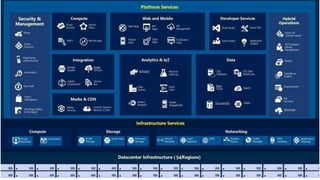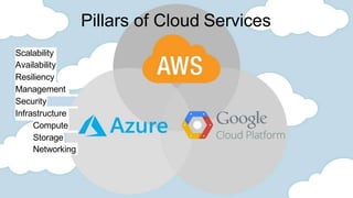 This document compares and contrasts the cloud platforms AWS, Azure, and GCP. It provides information on each platform's pillars of cloud services, regions and availability zones, instance types, databases, serverless computing options, networking, analytics and machine learning services, development tools, security features, and pricing models. Speakers then provide more details on their experience with each platform, highlighting key products, differences between the platforms, and positives and negatives of each from their perspective.