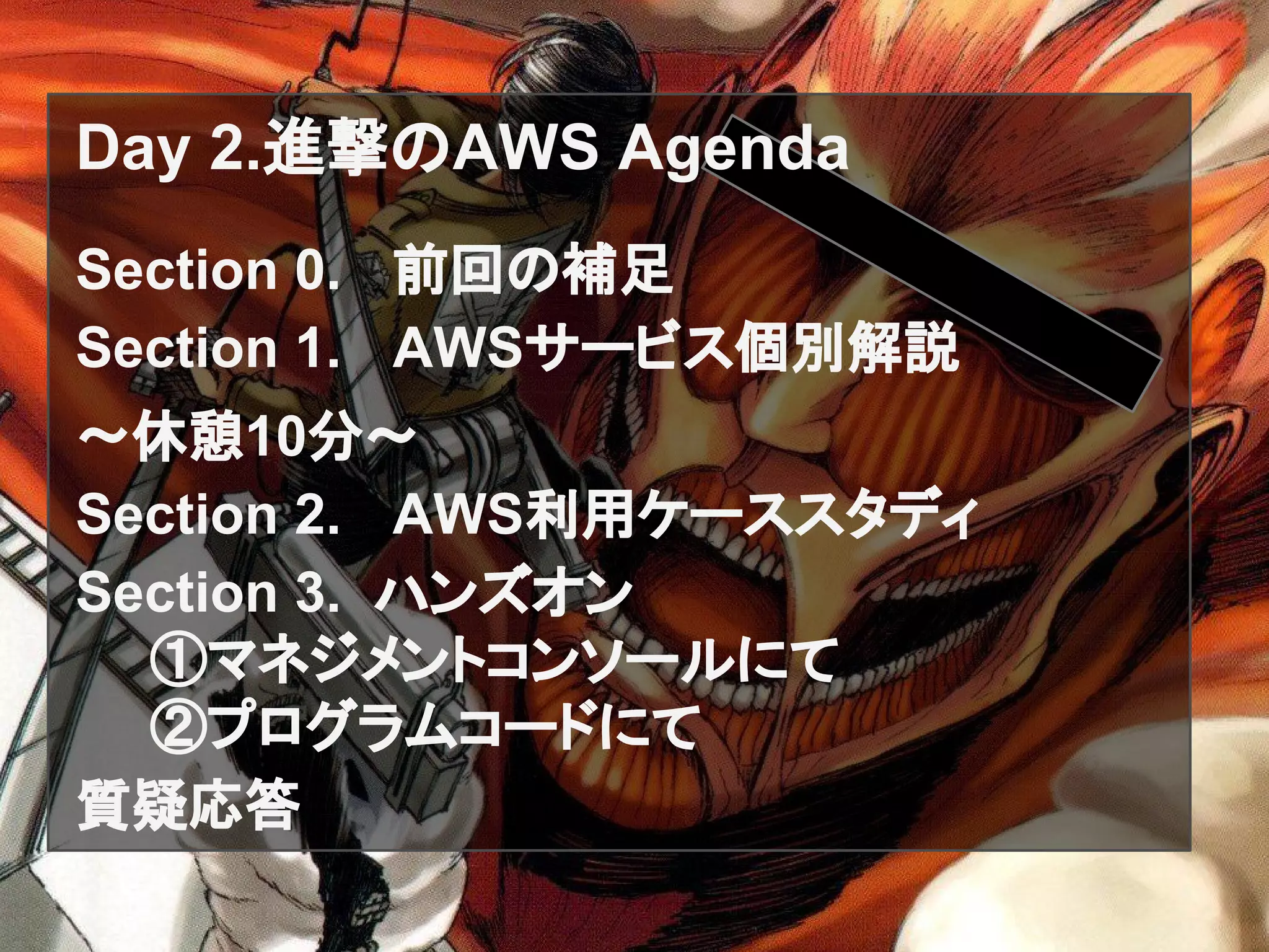 私が自社メンバー+関連会社の方向けに行った、AWSを軸としたクラウドサービス勉強会の資料です。 Day1: 「クラウドサービス再定義」 AWSの登場を機に本格的に変わったクラウドの世界。 Day1ではクラウドサービスとは何か?とこれからクラウドの 世界で起こっていく事象について解説します。 Day2:「進撃のAWS」 IaaSクラウド界の雄「AmazonWebServices」を題材に クラウドサービスの本質的な部分をハンズオンデモを交えて ご紹介します。