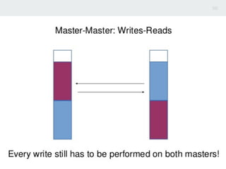 The document discusses scaling relational and NoSQL databases on AWS. It provides an overview of AWS RDS features for scaling databases, including read replicas, multi-AZ deployments, and maintenance windows. It also discusses database replication strategies like synchronous and asynchronous replication. For scaling write-intensive databases, it recommends database sharding and introduces AWS DynamoDB as a NoSQL option that scales for both reads and writes. Streams in DynamoDB enable triggers on row updates.