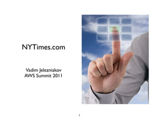 Vadim Jelezniakov from The New York Times Company discussed their use of AWS. NYTimes.com has over 38 million monthly US users and 984 million global page views. They moved to AWS for on-demand availability, cost-effectiveness, scalability, and flexibility. Examples included migrating 130 years of archives to S3 in 36 hours and rapidly scaling a new product called Skimmer from a prototype to production in 1 hour. They have since expanded to use AWS for over 27% of their total operational costs across data centers.