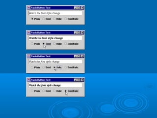 This document provides an overview of AWT and Swing. It discusses how AWT provides cross-platform functionality through abstract classes and platform-specific peer classes. It also summarizes the evolution of Swing from early versions of AWT that had limitations. Key points covered include: