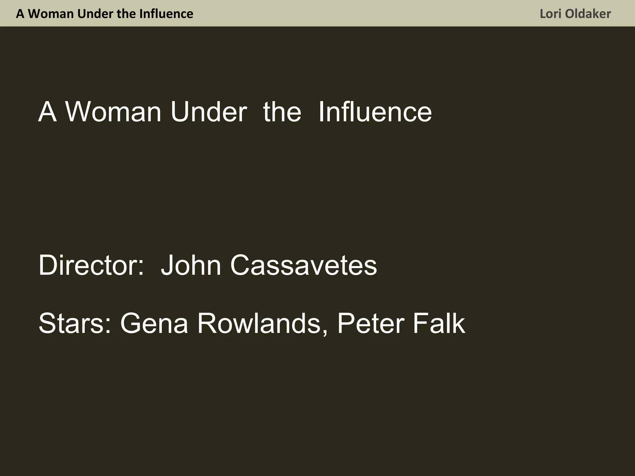 The document discusses the 1974 film "A Woman Under the Influence" directed by John Cassavetes and starring Gena Rowlands and Peter Falk. It explores themes of love and dysfunction, emptiness and madness, and dual standards of acceptable behavior. The film utilized a handheld camera style with natural lighting and neutral colors. Characters were portrayed in a casual and unkempt manner.