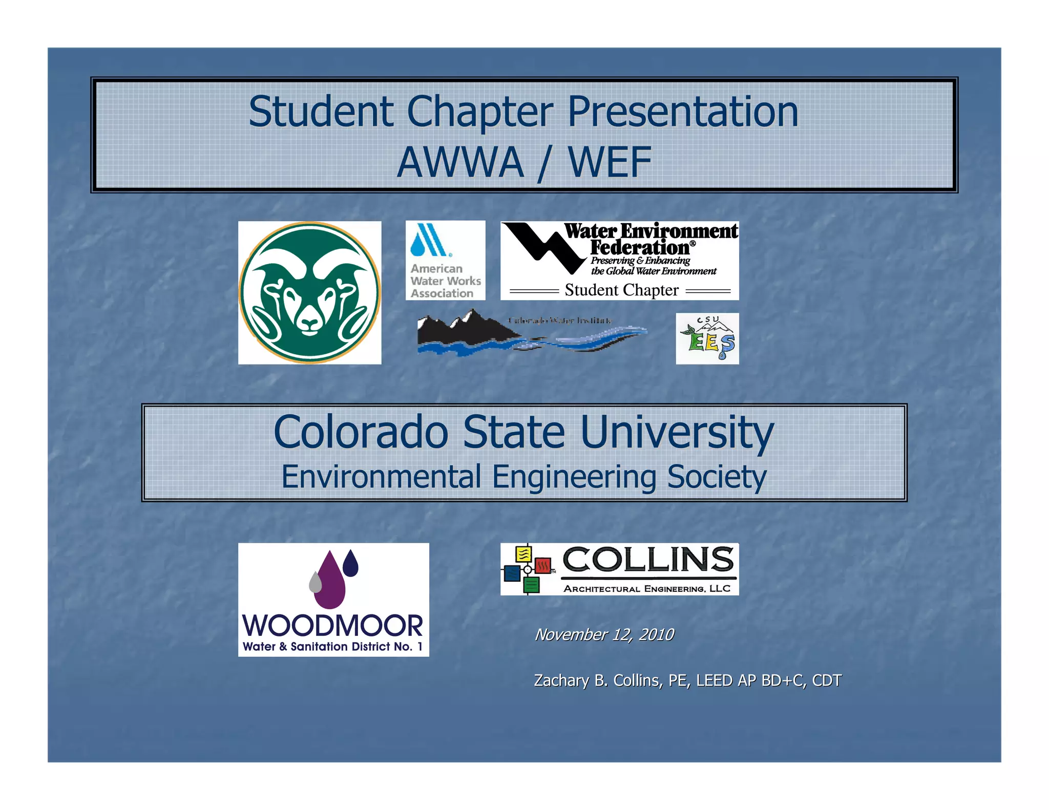 The document summarizes a presentation given by Zachary Collins, a district engineer, about his career in water resources engineering. It discusses his education background, professional licenses, and decade of experience working for various engineering firms. It also provides an overview of the water and wastewater infrastructure and daily responsibilities of the Woodmoor Water and Sanitation District where he currently works as district engineer. Examples of recent construction projects and efforts to improve data management through GIS implementation are highlighted. The presentation concludes with details about Collins' involvement in professional engineering associations.