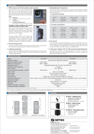 The AX-100/200TF is a compact, durable photoelectric detector with IP65 rating. It features selectable beam frequencies to avoid interference between multiple beams, as well as lightning protection and an anti-frost hood. The detector provides long detection ranges of up to 300m for the AX-100TF and 600m for the AX-200TF model.