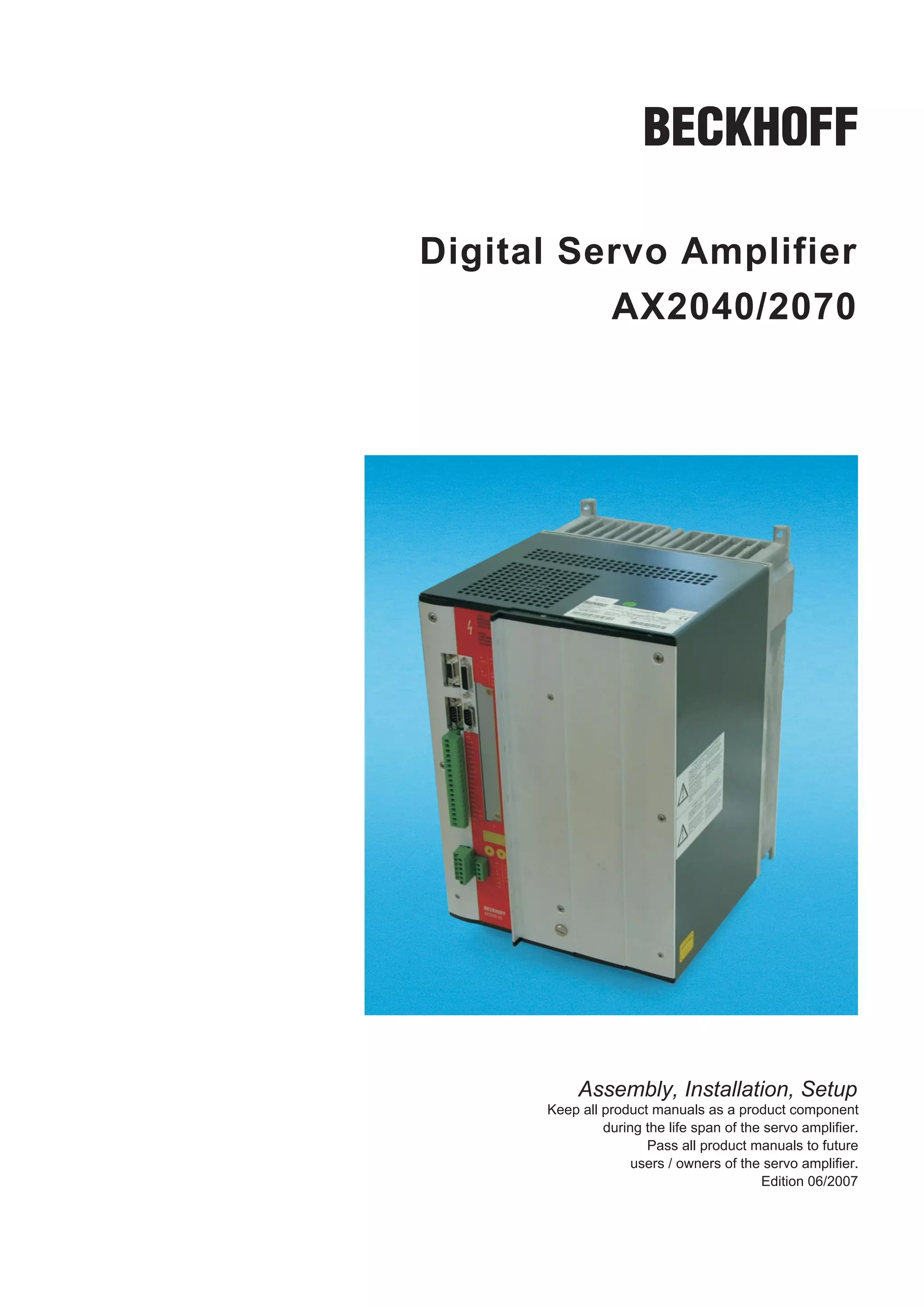 This document provides information about the installation, setup, safety, technical description, and specifications of the AX2040/2070 digital servo amplifier. It discusses keeping and passing along all product manuals, standards and approvals that apply, packaging and handling, the components included, technical details of the device, installation and setup instructions, and safety precautions including shock hazard protection.