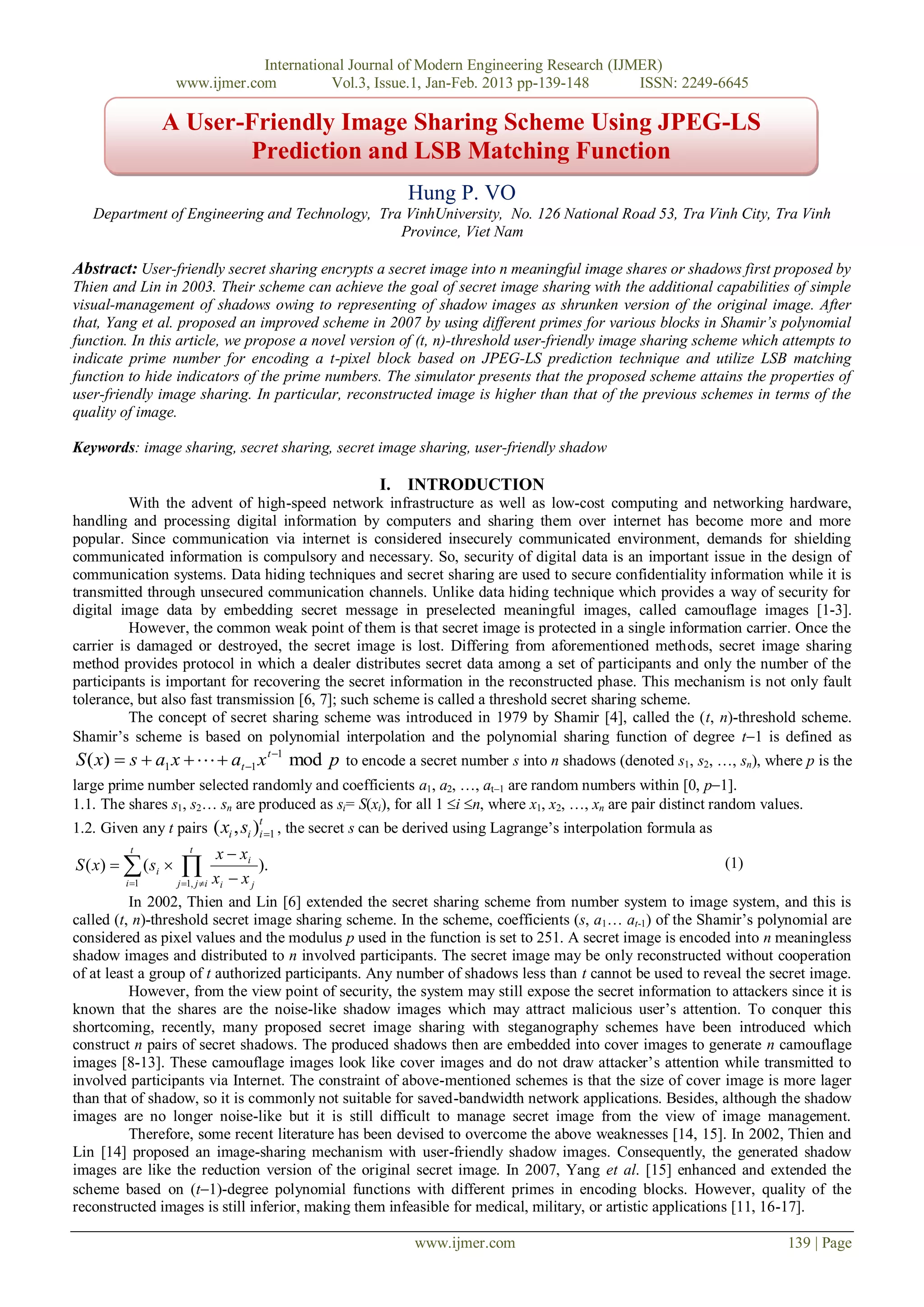 The document summarizes a proposed user-friendly image sharing scheme that uses JPEG-LS prediction and LSB matching functions. The scheme encodes a secret image into meaningful shadow images using different prime numbers for different blocks, as determined by JPEG-LS prediction. It hides the prime number indicators in the least significant bits of pixels using LSB matching to prevent image degradation. The experimental results showed the reconstructed image quality was higher than previous schemes, making it suitable for applications requiring high quality images like medicine, military, or art.