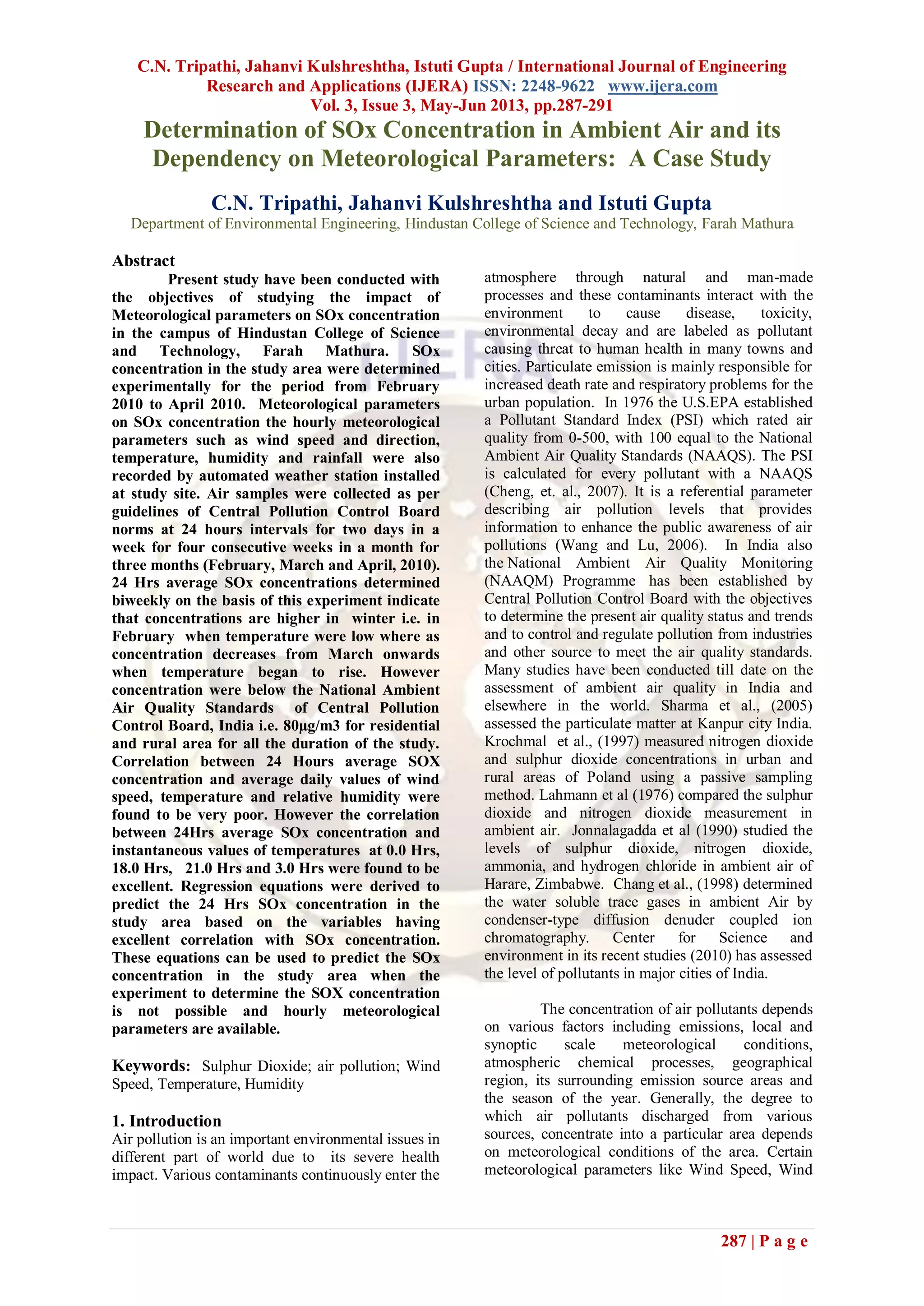 The study assessed the impact of meteorological parameters on sulfur dioxide (SOx) concentration at Hindustan College of Science and Technology from February to April 2010. It found that SOx levels were highest in February, with concentrations decreasing as temperatures rose, remaining below the national air quality standard. Regression equations derived from correlations with instantaneous temperature were developed to predict SOx concentrations when direct measurements are unfeasible.