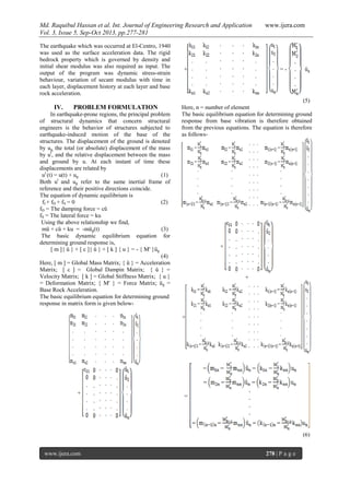 The document presents a study on base rock vibration characteristics utilizing a computer program to analyze dynamic stress-strain behavior from surface ground motion during an earthquake. It discusses the finite element method and central difference method used to solve one-dimensional shear wave equations, with input data based on soil properties and an earthquake record. The findings indicate varying acceleration and deformation between surface and base rock, highlighting the importance of these results for earthquake-resistant structural design.