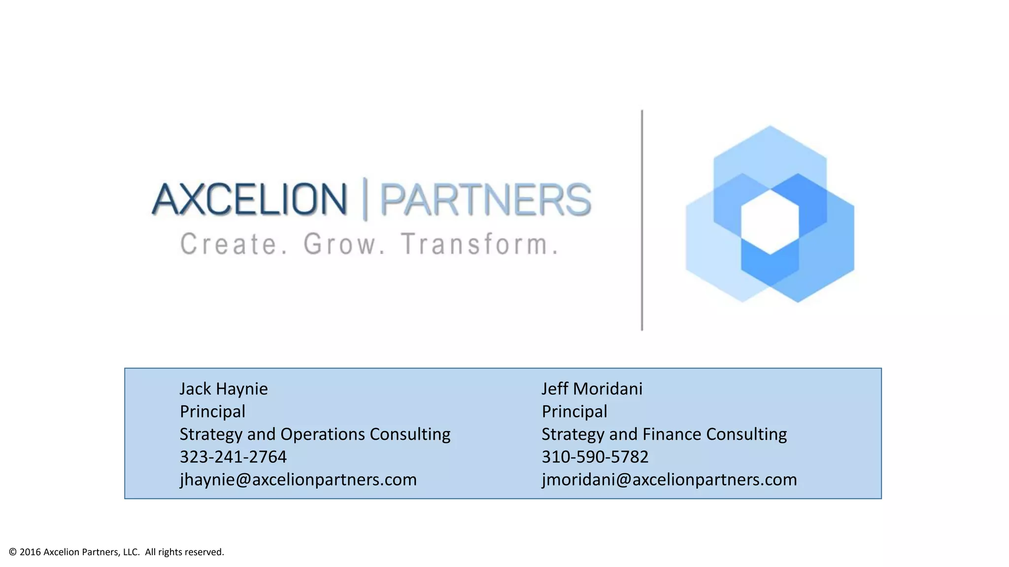 Axcelion Partners is a strategy and operations consulting firm that helps companies capture value. They have 35 years of experience working with companies of all sizes. Their services include developing and executing growth strategies, improving profitability, and transforming businesses. They work with start-ups, small and medium businesses across many industries.