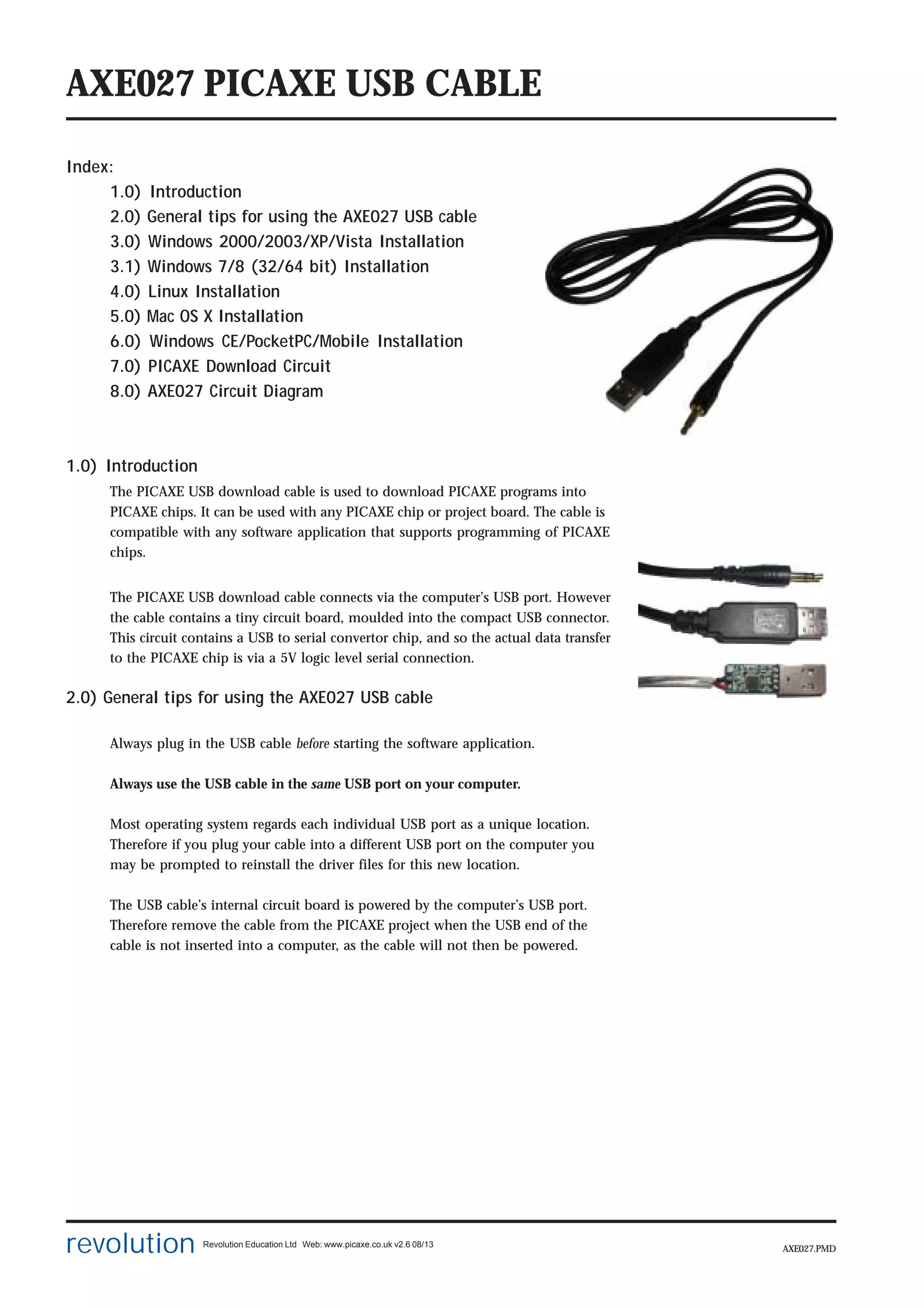 This document provides installation and usage instructions for the AXE027 PICAXE USB download cable. It can be used with any PICAXE chip or project board to download programs. The cable connects via USB and contains a circuit board with a USB to serial converter chip. The document outlines installation for Windows, Linux, and Mac operating systems. It provides tips on always using the same USB port and explains how the operating system assigns a virtual COM port for communication. It details how to install drivers, check the assigned COM port number, and change the COM port if needed.