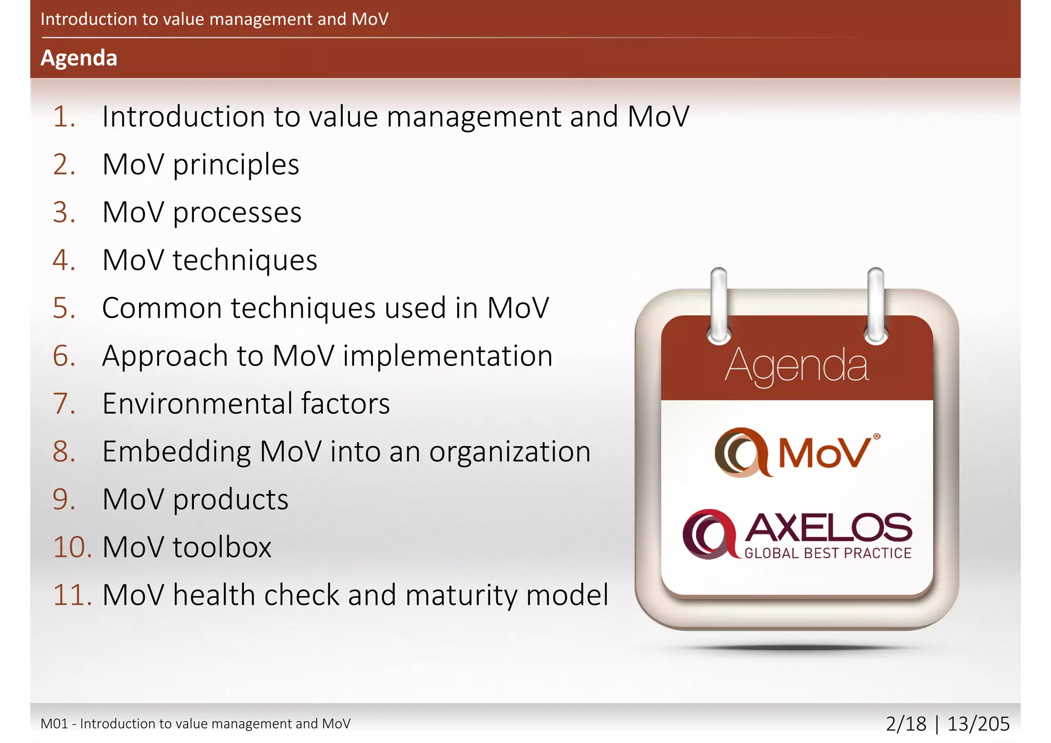 The document provides an introduction to value management and Management of Value (MoV). It defines key concepts like value, value management, benefits, outcomes and dis-benefits. It explains that MoV is a process-based approach that focuses on what things do (their functions and value drivers) rather than what they are. MoV aims to maximize value in line with objectives and stakeholder requirements. It does this through a number of processes and techniques applied in a structured manner. Using MoV provides benefits such as more efficient delivery, clearer objectives and scope definition, optimal balance between investment and costs, and innovation aligned with goals.