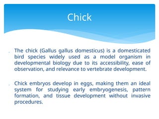 The document discusses the significance of chick embryos (Gallus gallus domesticus) in developmental biology, particularly concerning axes and pattern formation during early development. Key processes include the establishment of the anterior-posterior, dorsal-ventral, and left-right axes, which are guided by signaling centers such as the primitive streak and Hensen's node. Additionally, factors like BMP signaling, nodal expression, and the influence of the zone of polarizing activity are highlighted in the context of organ symmetry and limb patterning.