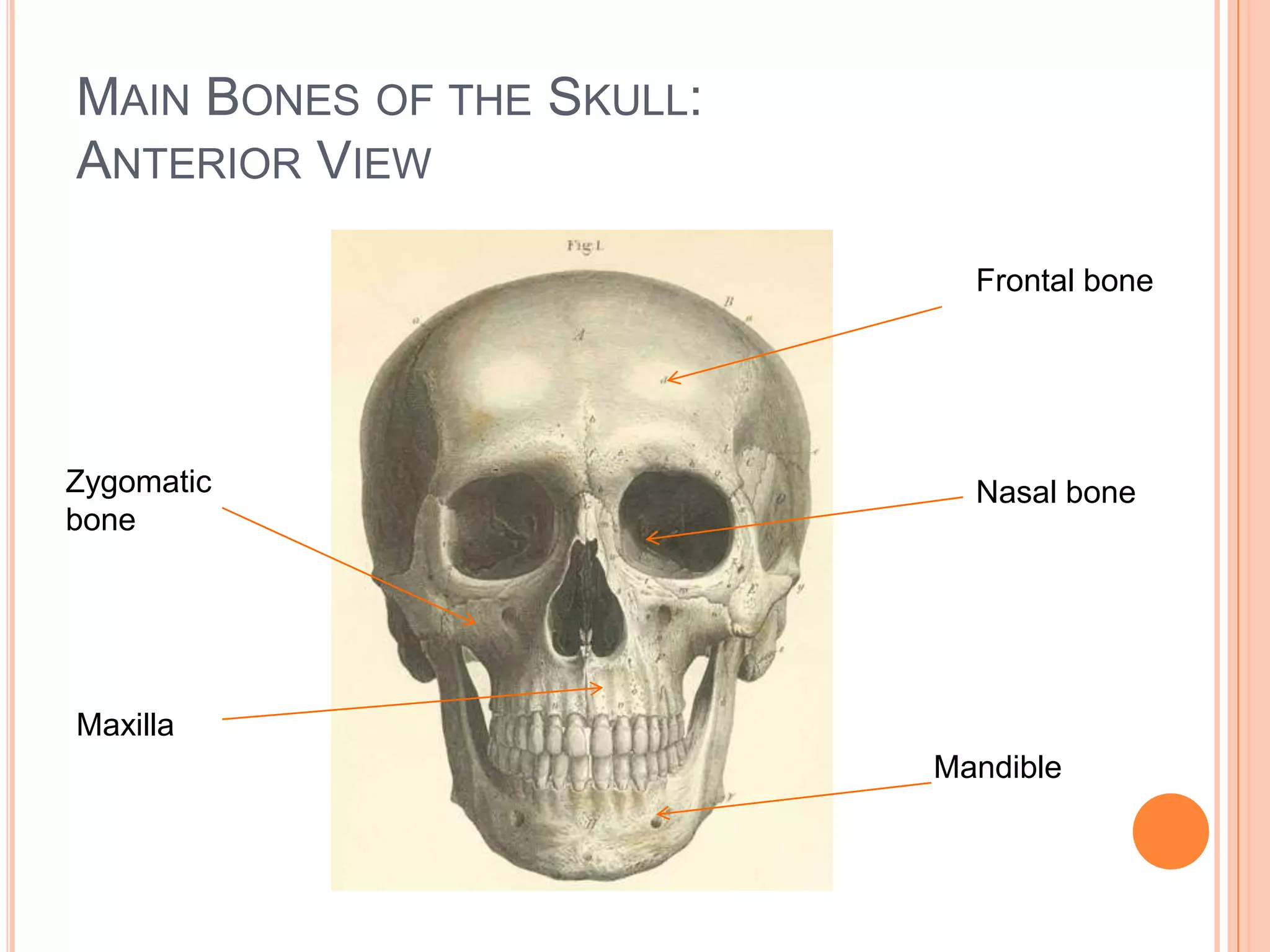 The document provides information about the bones that make up the axial skeleton, including the skull, vertebral column, rib cage, and sternum. It lists the main bones of the skull, such as the frontal bone and mandible, and describes features like the coronal suture and foramen ovale. It also details the bones that compose the vertebral column, including the 33 vertebrae and intervertebral discs. Finally, it distinguishes between true, false, and floating ribs and identifies parts of the sternum like the manubrium and xiphoid process.