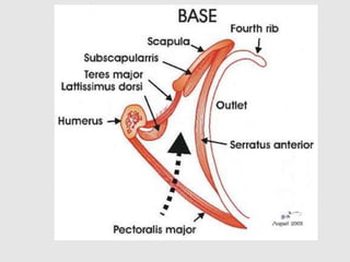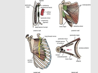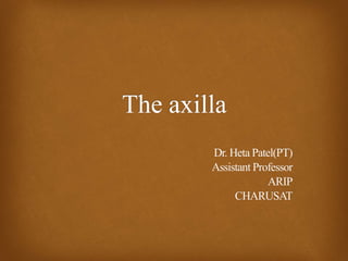 The axilla is the triangular space between the upper arm and chest. It contains nerves, blood vessels, and lymph nodes passing between the neck and upper limb. The walls are formed by muscles and ribs. The axillary artery begins as a continuation of the subclavian artery and divides into three parts above, behind, and below the pectoralis minor muscle. It gives off several branches and terminates becoming the brachial artery. The axillary vein accompanies the artery and drains into the subclavian vein.