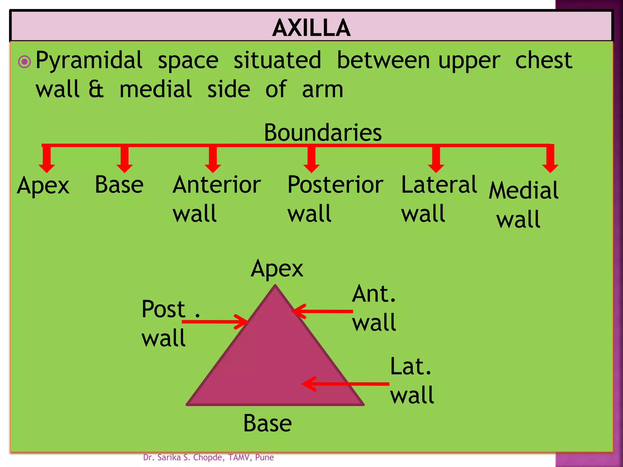 The axilla is a pyramidal space between the upper chest wall and medial arm. It is bounded by the scapula superiorly, clavicle posteriorly, and first rib laterally. Several muscles including pectoralis major, latissimus dorsi, and subscapularis form its walls. The axillary artery and brachial plexus pass through the axilla along with lymph nodes and fat.
