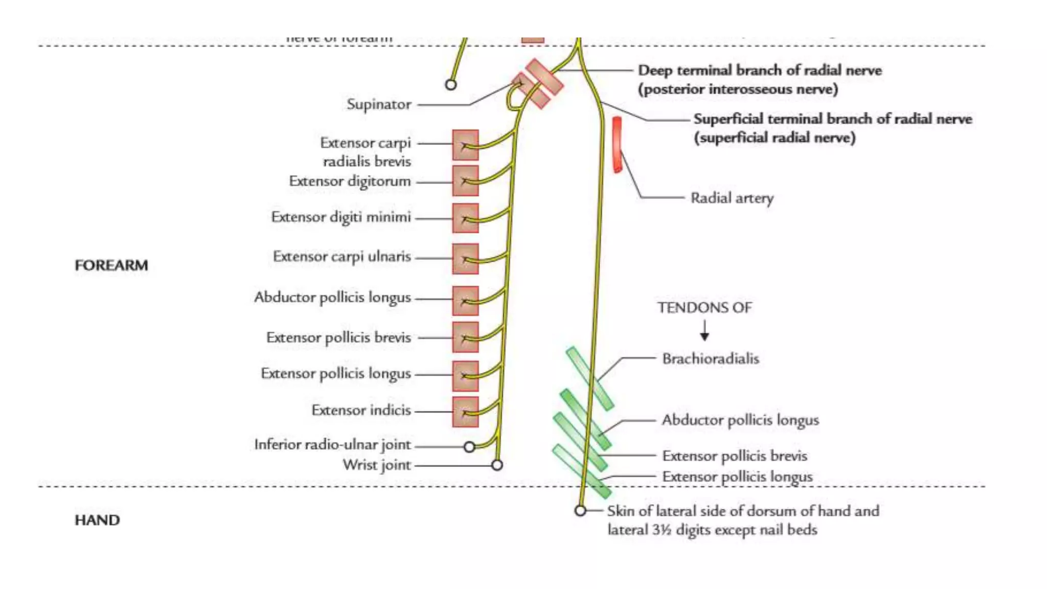 • It provides sensory innervation to the skin down the middle of the back of the forearm up to