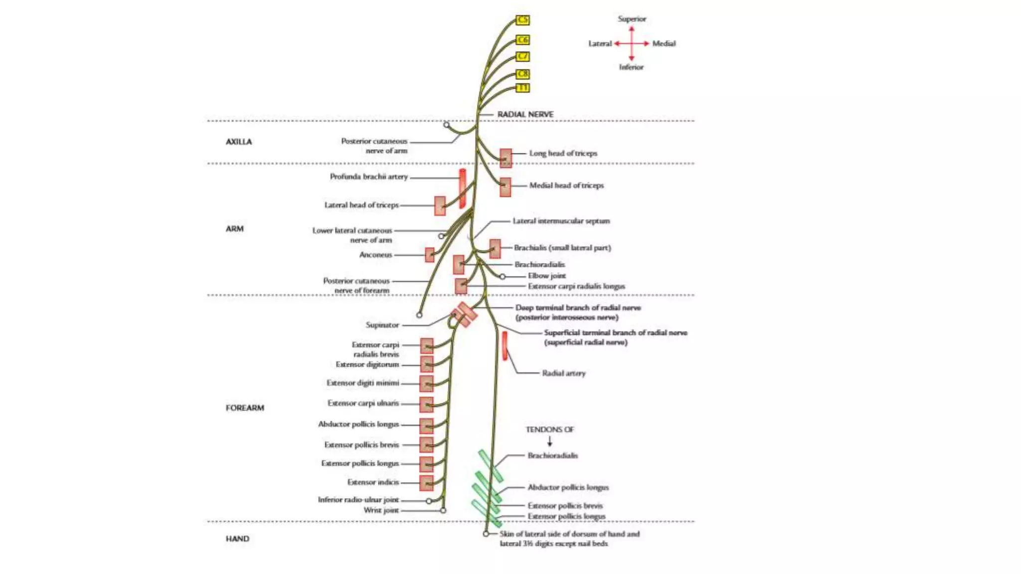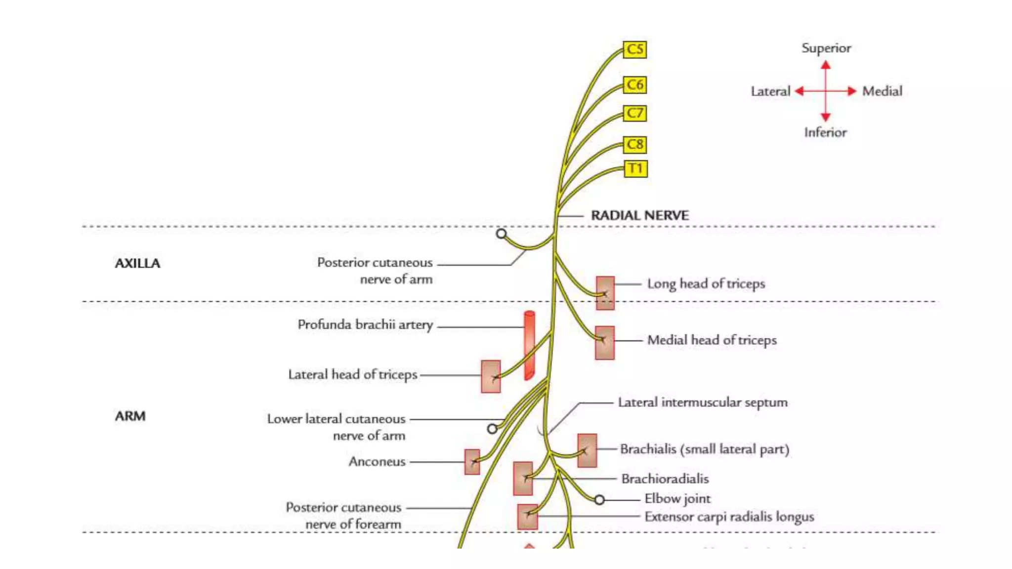 • Posterior cutaneous nerve of arm (which provides sensory innervation to skin on the back of the arm
