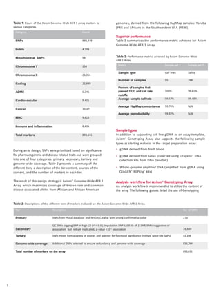 The document describes the Axiom Genome-Wide AFR 1 Array, which provides high coverage of genetic variants associated with disease in African and African American populations. It was designed to maximize coverage of common and rare variants down to a minor allele frequency of 1% in specific gene regions and disease-associated areas. The array contains over 893,000 SNPs selected from genome-wide association studies and databases of disease-associated variants. It enables genome-wide association studies, replication, and fine mapping with one experiment.