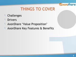 Axonshare is a collaborative content management solution designed to enhance productivity, improve compliance, and facilitate knowledge sharing within organizations by allowing users to collaboratively manage documents and projects in a secure environment. It addresses common challenges such as document retrieval inefficiencies and the loss of critical information due to poor distribution and version control. The solution provides features like team collaboration workspaces, personalized dashboards, and integration with tools such as Microsoft Office to streamline workflows and improve operational efficiency.