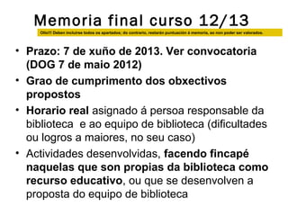 • Terase en conta a valoración da memoria do presente curso para apara a