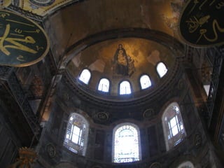 Hagia Sophia was originally built in 532-537 AD in Istanbul, Turkey as an Eastern Orthodox patriarchal cathedral. It was later converted to a mosque in 1453 after the Ottoman conquest and became a museum in 1935. Some key features include its massive dome supported by pendentives, 40 arched windows that flood the interior with light, and Byzantine-style mosaics depicting emperors and religious scenes. It was an architectural marvel that influenced buildings for centuries and is still one of the most significant surviving examples of Byzantine architecture.