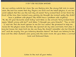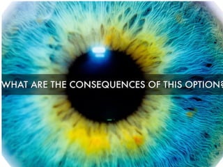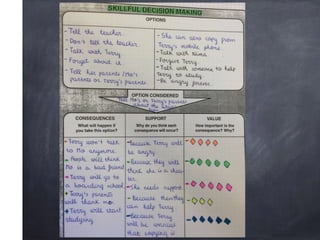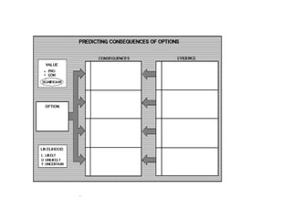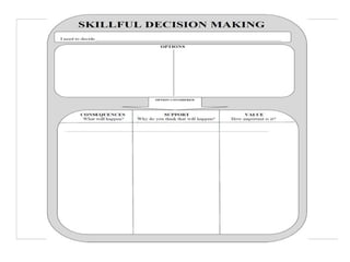 This document discusses critical thinking skills such as problem solving, decision making, and generating ideas. It also introduces Thinking Maps as a tool to help develop these skills. Specific thinking maps are presented, including a decision making map that outlines the steps of identifying options, consequences, importance of consequences, and selecting the best option. The document concludes by mentioning a persuasive letter as a final project and discussing advantages and drawbacks in the critical thinking process.