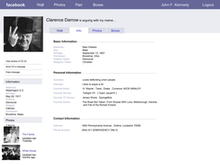 This document appears to be a mock Facebook profile for Clarence Darrow, the famous American lawyer. The profile includes basic information like date of birth, hometown, education and interests. It also includes mock Facebook posts where "Clarence Darrow" comments on events that occurred during the Kennedy administration such as the Cuban Missile Crisis and putting a man on the moon.