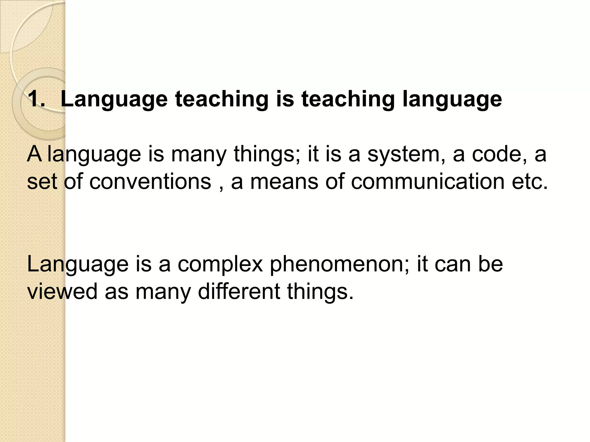 1. Language teaching involves teaching vocabulary, structures, pronunciation, and function. However, languages differ in their rules and conventions.