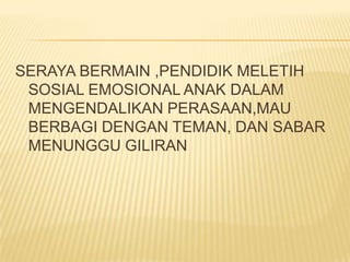 Bermain sambil belajar membantu pendidik melatih keterampilan sosial emosional anak, seperti mengendalikan perasaan, mau berbagi, dan sabar menunggu giliran.