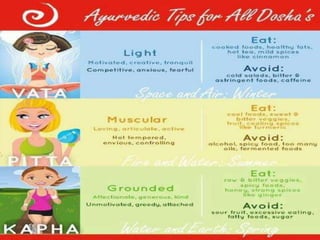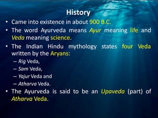 Ayurveda, an ancient Indian system of medicine originating around 900 B.C., emphasizes the harmony between the universe's five elements and human health, classifying it through the doshas: vata, pitta, and kapha. It employs a holistic approach to diagnose and treat individuals based on their unique body constitution, aiming to balance the doshas and eliminate toxins for overall well-being. The practice incorporates various branches, including medicine, surgery, and pediatrics, highlighting its comprehensive nature in healthcare.