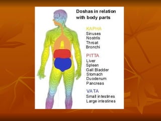 The document provides an overview of Ayurveda, the ancient Indian system of medicine and lifestyle practices. It discusses key Ayurvedic concepts like the doshas (Vata, Pitta, Kapha), dhatus (bodily tissues), malas (waste products), and therapies including herbal medicine, massage, aromatherapy, color therapy and more. Ayurveda views health as a balanced state and sees illness as an imbalance that can be corrected through natural means without side effects.
