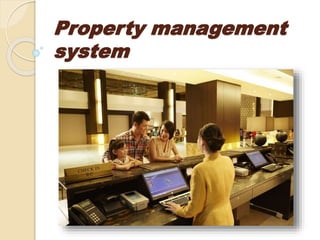 A property management system (PMS) is a software system used by hotels to manage reservations, front desk operations, housekeeping, and other functions. A PMS handles tasks like processing reservations, tracking room availability and rates, recording guest profiles, and managing the night audit process. It integrates with other hotel systems and departments to support functions such as food and beverage management, accounting, security, and human resources. Common PMS software modules include front desk operations, reservations, housekeeping, maintenance, and accounting features.