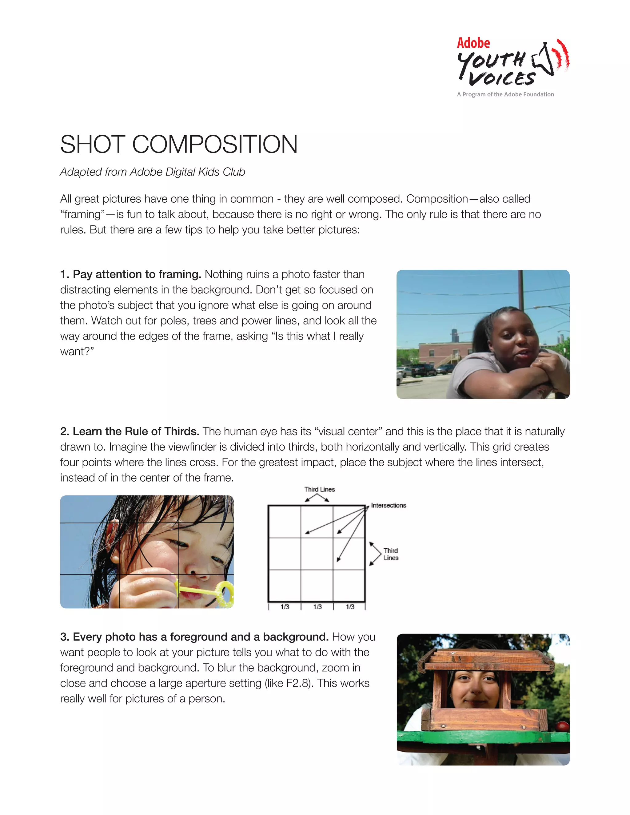 The document discusses various techniques for composing shots and framing photographs effectively. It recommends paying attention to elements in the frame and background, following the rule of thirds for subject placement, adjusting the foreground and background with aperture settings, changing the line of sight and camera angles, including elements that guide the eye, finding patterns, getting close for texture and details, and cropping to emphasize the intended subject. It also defines different types of camera shots and angles that can be used.