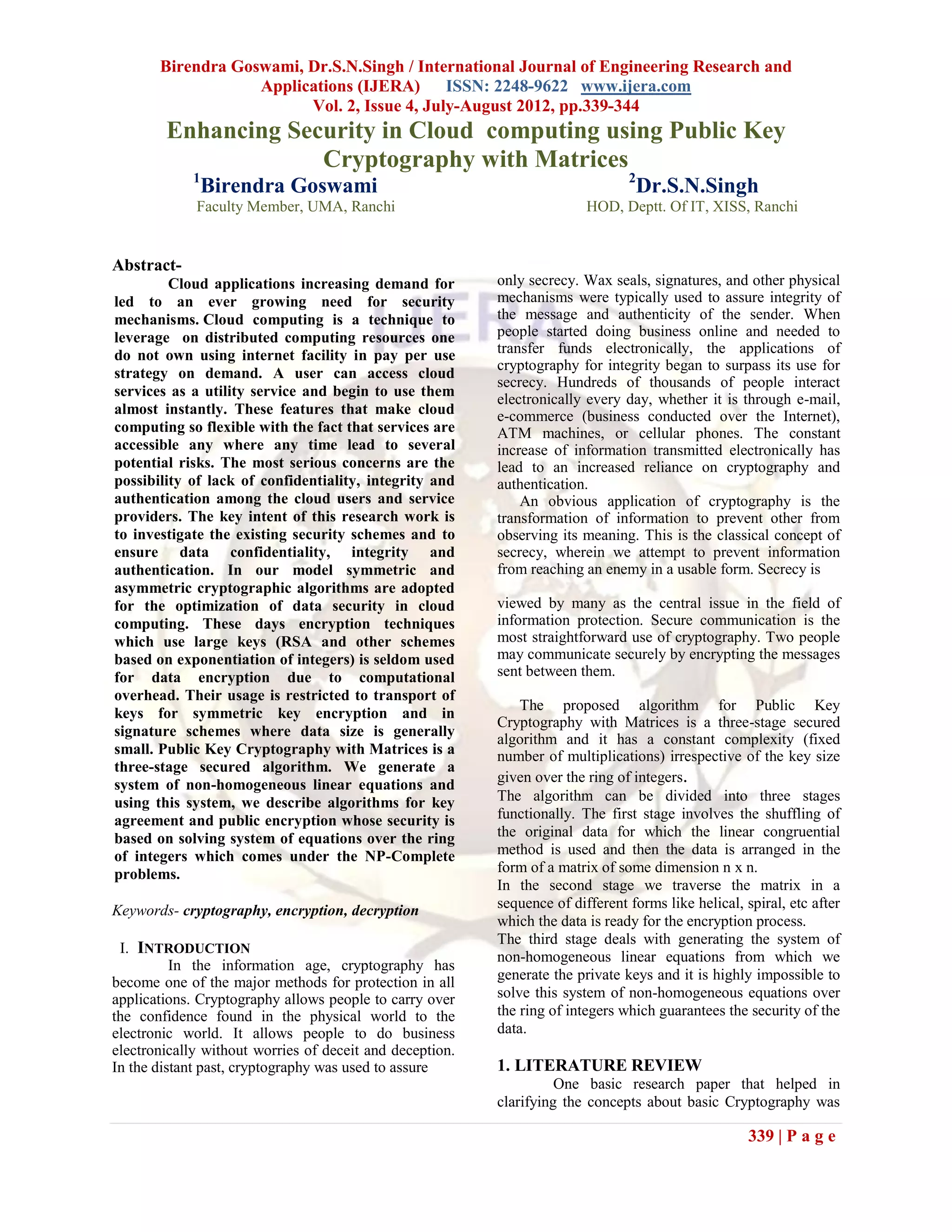 This document presents a proposed algorithm for public key cryptography using matrices. The algorithm has three stages: 1) shuffling the original data using a linear congruential method and arranging it in a matrix, 2) traversing the data matrix in different patterns, and 3) generating a system of non-homogeneous linear equations from the matrix to derive private keys. The algorithm aims to provide data confidentiality, integrity and authentication for cloud computing applications using public key cryptography with matrices in a way that has constant complexity regardless of key size.