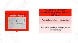 The document discusses the simple present and present progressive tenses. The simple present expresses daily habits, general statements of fact, or situations that exist always, usually, or habitually. The present progressive expresses an activity that is in progress at the time of speaking. It uses "be" verbs like "am, is, are" plus the "-ing" form of the verb. Examples are given to illustrate when to use each tense.