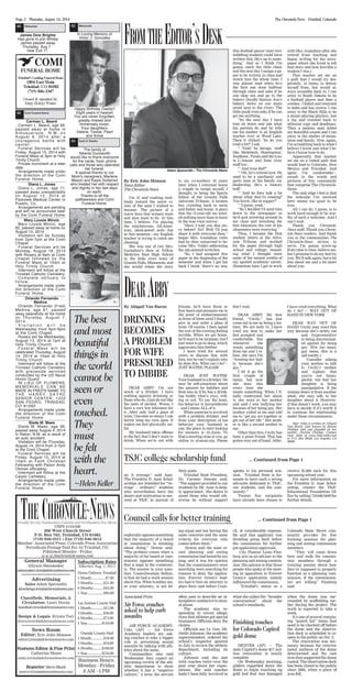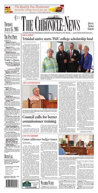 This document is a newspaper listing various community events and announcements taking place in and around Trinidad, Colorado. It includes notices for economic development and water association meetings, a hospital open house, weekend activities at Trinidad Lake State Park including campfire programs and hikes, a correctional facility training exercise, a farmers market, mass at a local shrine, art show calls for submissions, the upcoming Trinidad Roundup festival, low-cost animal spay/neuter services, suicide/abuse hotlines, weather forecasts, river water levels, and a article about a Trinidad native who established a scholarship fund for local community college students.