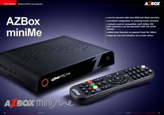 The AZBox miniMe is a small Linux-based HDTV receiver. It has an attractive compact design that allows it to integrate well into a home entertainment system. It offers connectivity options like HDMI, S/PDIF, LAN and supports common video formats. The receiver can be controlled remotely using an optional infrared receiver and has a simple intuitive on-screen menu.