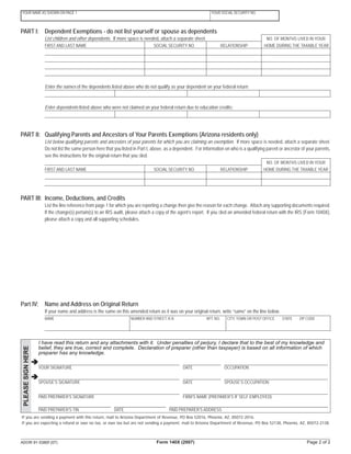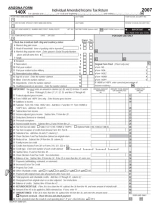 This document is an amended individual income tax return form for the state of Arizona for the year 2007. It provides lines to update information such as filing status, exemptions, income amounts, deductions, credits, payments and the amount of refund or taxes owed. The filer must provide reasons for any changes from the original return and attach any supporting documentation.